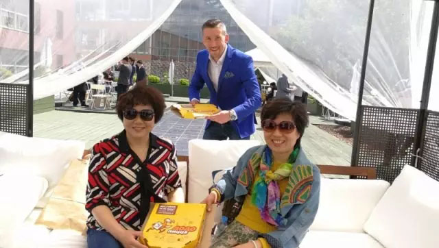 (图为任董事长在DODO总部品尝披萨)